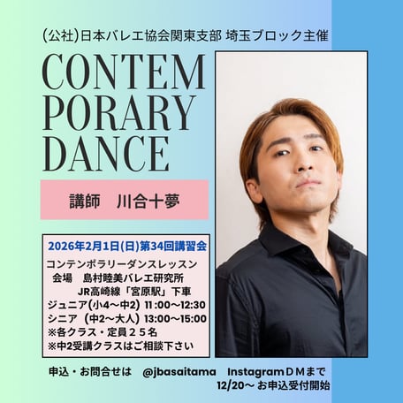 クラス内容は、最初に短めのクラシックのバーレッスンを行なってからコンテンポラリーの動きをしたいと思っております。皆様のご参加お待ちしております✨